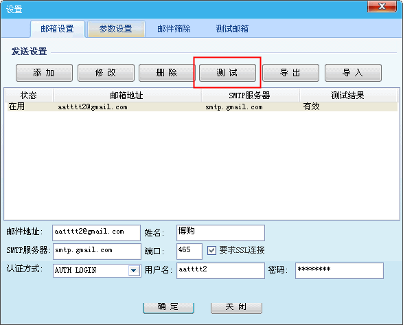 4.最后,点击设置界面中的[测试]按钮,检查添加的发送邮箱是否可以正常发送邮件。