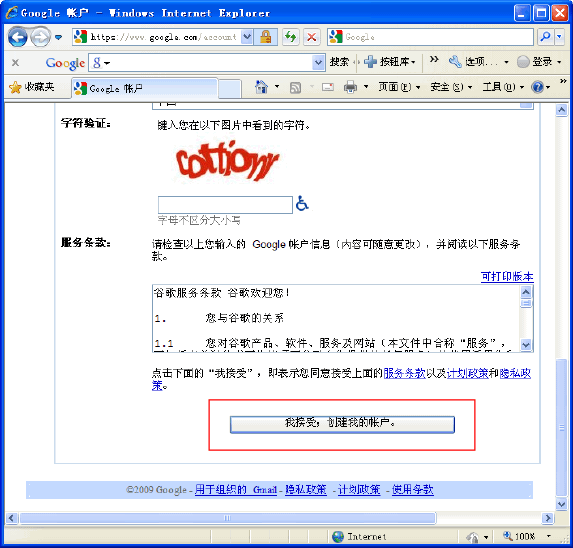 3.如上图,点击[创建帐号],即可创建自己的GMail邮箱,点击[我接受,创建我的账户]完成最后的创建。