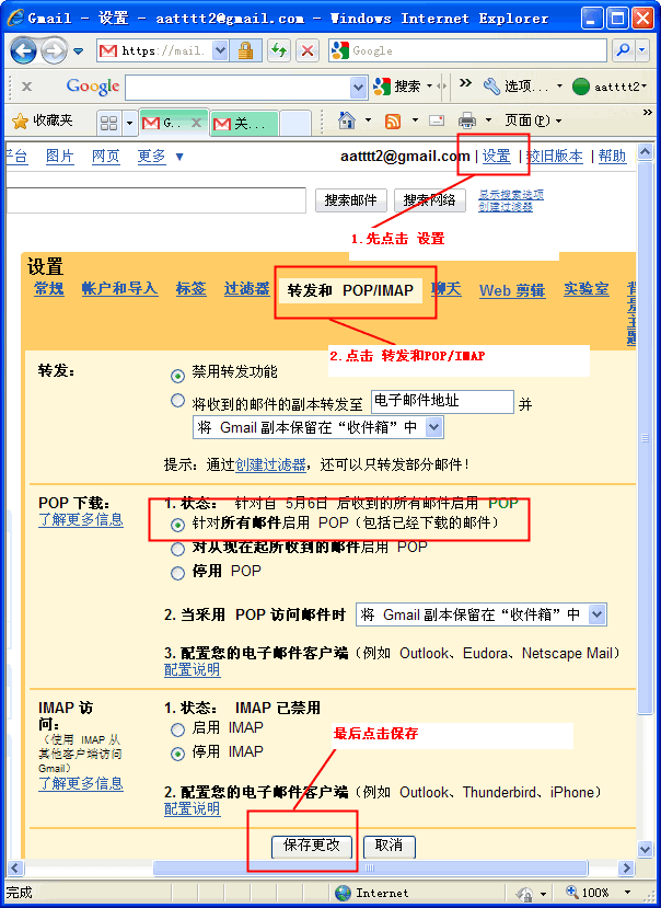 4.用刚才创建的邮箱帐号,登录Gmail,并设置POP选项。